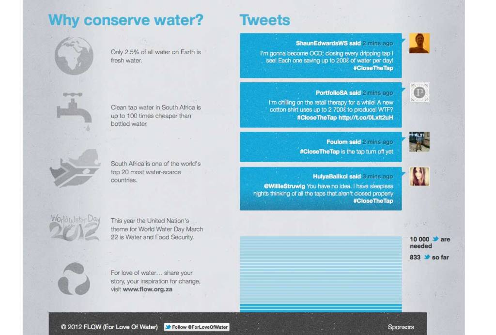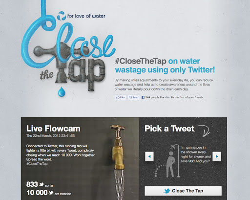The ‘Close the Tap‘ campaign was launched by For Love of Water out of Capetown, South Africa in 2012 which aimed to encourage people worldwide to think about the usage of water resources and develop the habit of saving water. Using the social media platforms of Twitter and Facebook, it encourages people to post on Facebook or tweet using the hashtag #CloseTheTap, which will close the real-life running tap using recycled water streamed live on its site.
