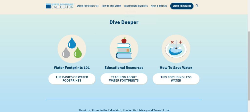 Nation Geographic: Water Footprint Calculator was created by people at National Geographic where there are some light-hearted approaches for you to measure your usage across a variety of fields and make a pledge to lower your water consumption. And also you can share your green lifestyle and some water-saving tips with your friends on it.
