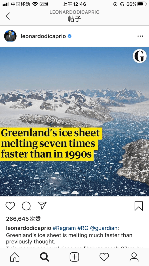Here I take one of the most famous and my favourite actor–Leonardo Dicaprio as an example, in addition to the actor, he is also an environmentalist in his daily life who attend all kinds of environmental events regularly and even set up a foundation named after himself to provide financial support to global non-profit environmental protection agencies. Also, on his personal social media, there are almost all posts calling for attention to environmental issues like global climate change, water scarcity and ocean pollution. It’s so admirable that he use his fame, his influence to get people’s attention to environmental issues.